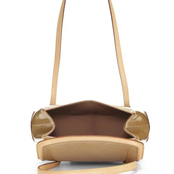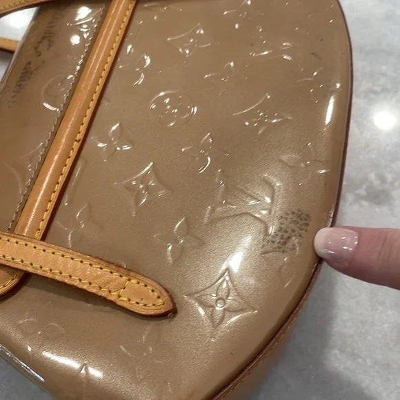 AUTHENTIC This is an authentic LOUIS VUITTON Vernis Biscayne Bay GM in Noisette. Product Code: APRIL 2005 made in FRANCE.This chic shoulder bag is crafted of Louis Vuitton monogram-embossed in patent leather in dark beige. The bag features natural vachetta cowhide leather shoulder straps, trim, and base, and gold hardware. This opens to a brown fabric interior with patch pockets.BrandLouis VuittonStyleShoulder BagStructured and chic, this petite Biscayne Bay silhouette comes crafted from Noisette Vernis patent leather with house-signature Vachetta leather trim and gold-tone brass hardware at the closure. Stash your out-and-about essentials inside, and enjoy it for any of the plans on your calendar.Purchase with Confidence:POSHMARK WILL AUTHENTICATE FOR YOU AS A BENEFIT OF THE SALES PROCESS!!!! Features:Two Leather Shoulder StrapsMagnetic Snap ClosureInterior Slip PocketPatent LeatherFabric LiningGold HardwareDetails:Length: 10" (25 cm)Height: 6" (15 cm)Depth: 2.75" (6 cm)Strap Drop: 8" (20 cm)Made in FranceCondition:Straps and Edging of purse are in excellent condition. Water marks (slight) on each edge of leather underlining of purse as pictured. In very good condition.There are two smudges on the back of the purse as pictured does not effect the function of the purse. Also there is a slight blue pen mark under the flap of the purse as pictured.See pictures and video for further information on condition.LV Bin[408]