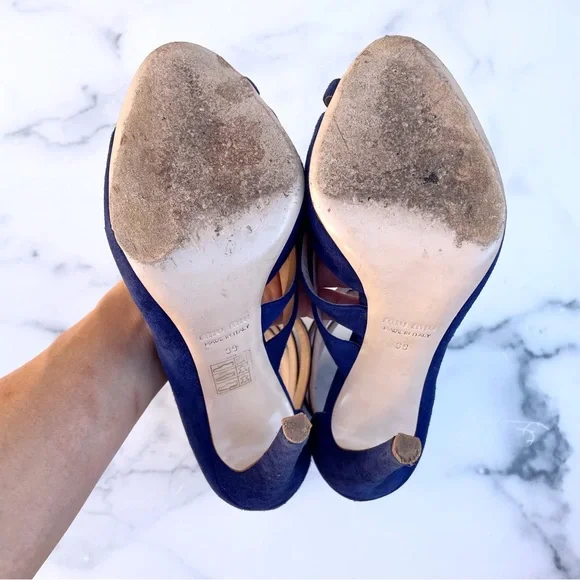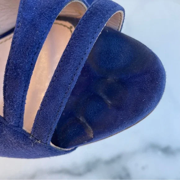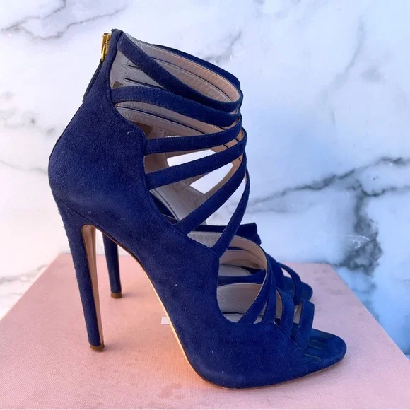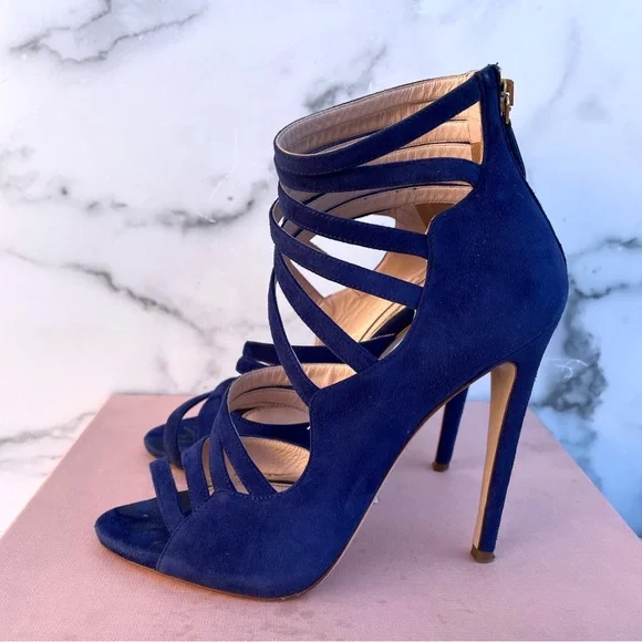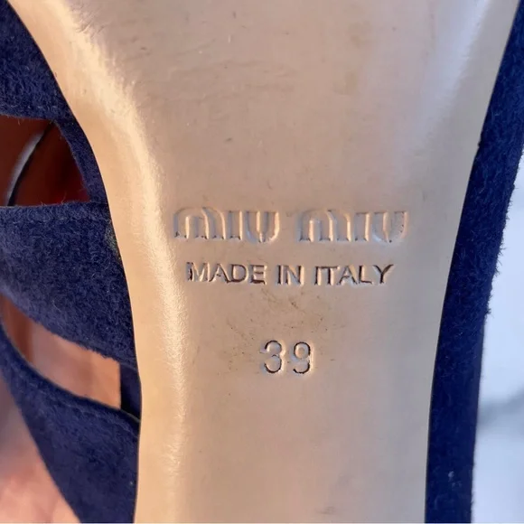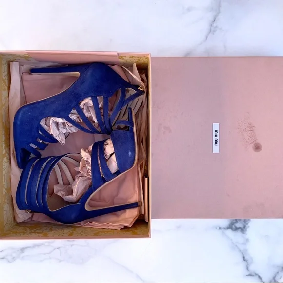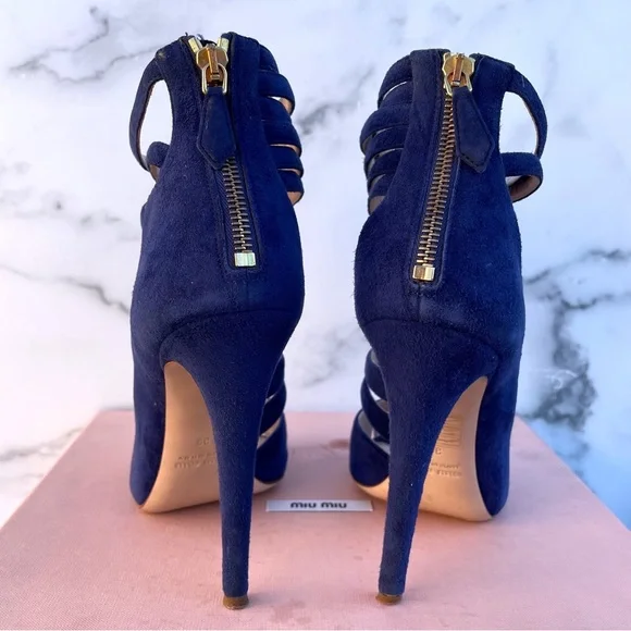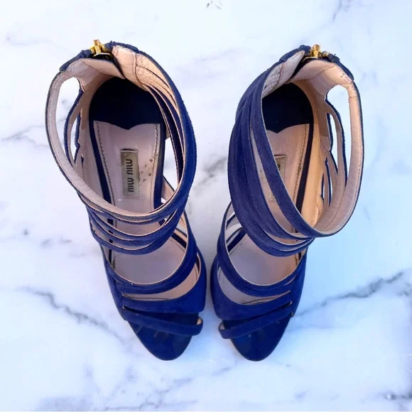 100% authentic Miu Miu Asymmetric strappy navy blue suede sandal, size 39. As seen on Demi Lovato! There is wear on the soles, toe imprints on the insoles, and minor scuffs on the sides. Overall, these beauties are in good condition! Comes with box and dust bags. Retail $890.Miu Miu soft blue suede stiletto-heel sandals are styled with asymmetric strappy bands at vamp and ankle.* 4.5" (115mm) suede-covered stiletto heel* Peep toe* covered heel counter* Exposed goldtone zipper at counter.* Leather sole.* Made in Italy.