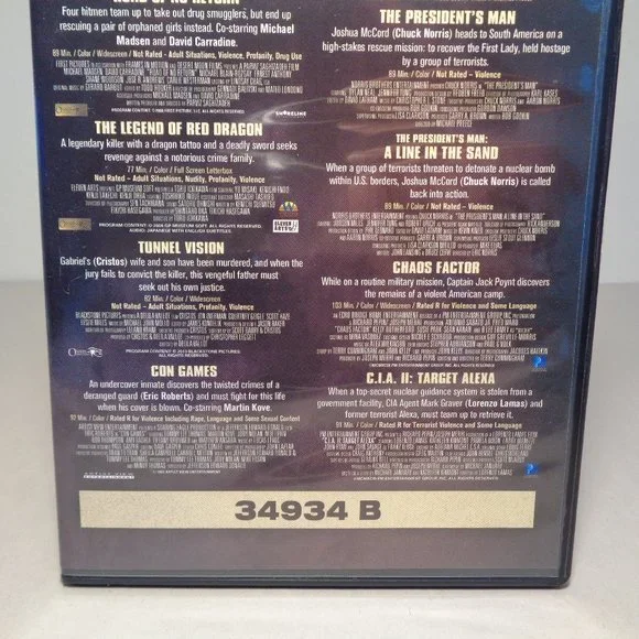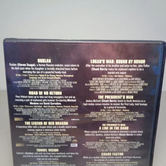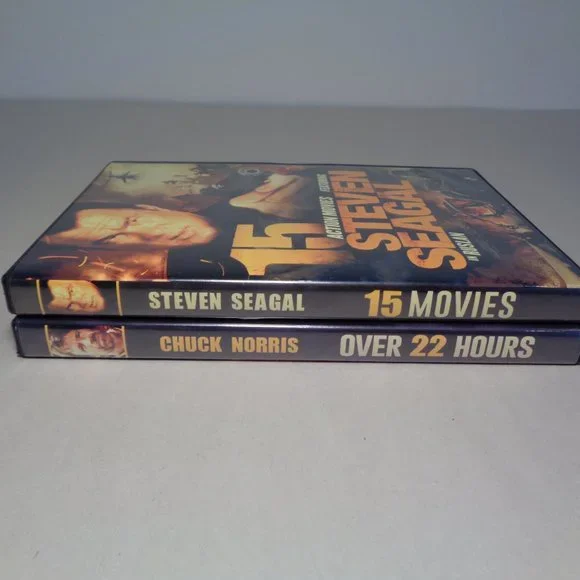 15 Action Movies Featuring STEVEN SEAGAL and CHUCK NORRIS New DVD 3 Disc SetNew and sealedMovie and DVD Info(see pictures)Movies:-Ed McBain's 87th Precinct:Ice-The Sweeper-A Father's Revenge-One Down Two To Go-The Spy Killer-Ruslan-Road Of No Return-The Legend Of Red Dragon-Tunnel Vision-Con Games-Logan's War:Bound By Honor-The President's Man-The President's Man:A Line In The Sand-Chaos Factor-C.I.A. II:Target AlexaSKU 6044A