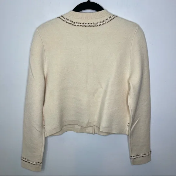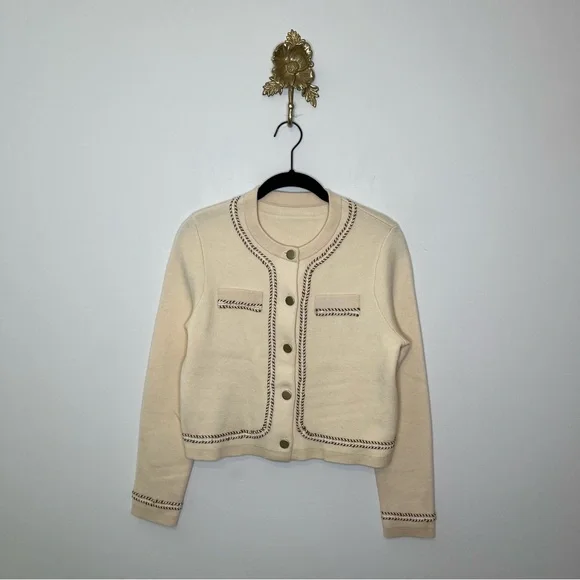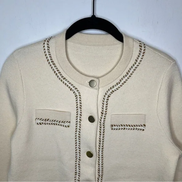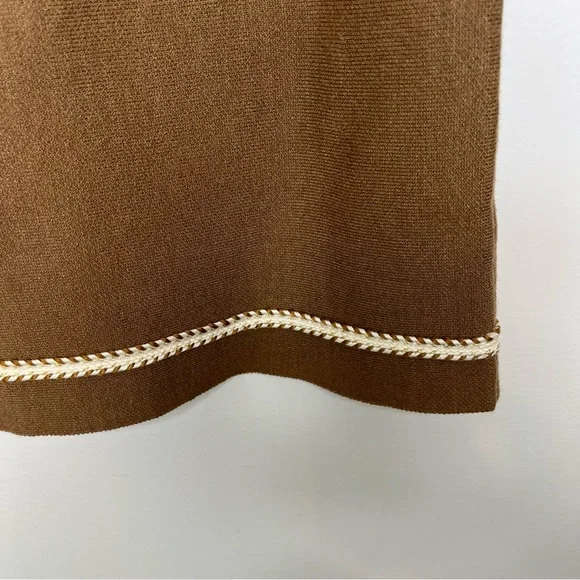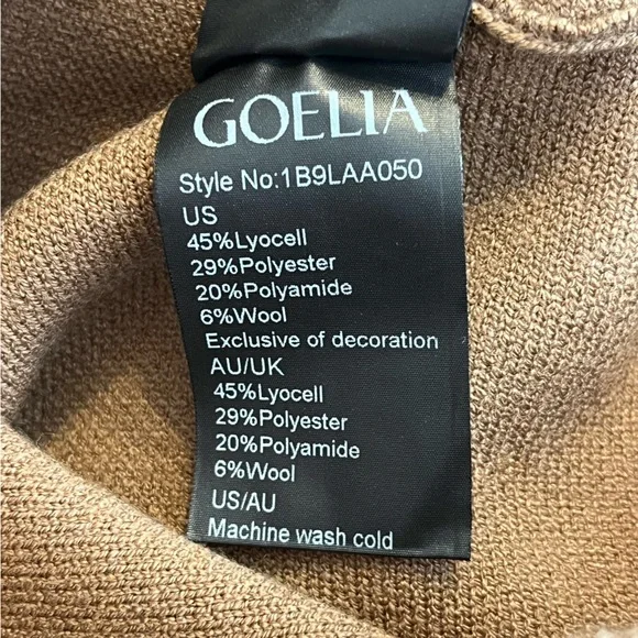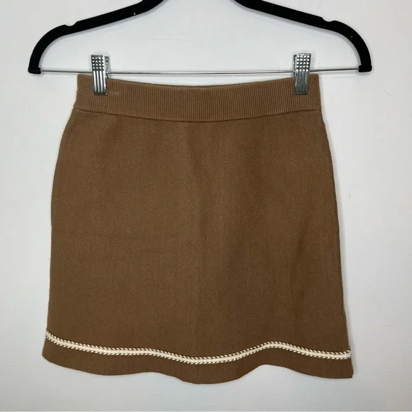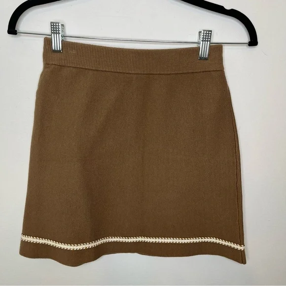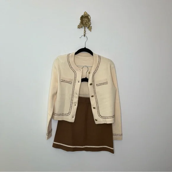 Goelia Knitted Cardigan and Skirt Set SCondition: new with tagsColor: cream and brown Size: Small Measurements are approximate; taken while garment is lying flat: Knitted Cardigan: 18" across chest, 18" length, 23" sleeve lengthSkirt: 12" across waist, 16.5" length Other features: This suit is made of Tencel wool fabric, which provides natural stretch and ensures comfortable wear. It is suitable for spring, autumn, and winter seasons. The classic boxy jacket design is not too strict, with straight lines creating an elegant and sophisticated look. The clean and sharp lines of the suit help accentuate the body shape, providing a flattering fit.KR 530+531